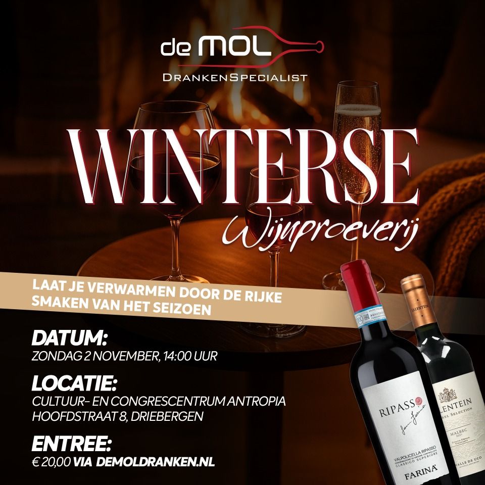 Laat je verwarmen door de rijke smaken van het seizoen tijdens onze Winterse Wijnproeverij op zondag 2 november georganiseerd door de Mol DrankenSpecialist in het sfeervolle Cultuur- en Congrescentrum Antropia. Een middag vol smaakvolle ontdekkingen, gezelligheid en natuurlijk: heerlijke wijnen.