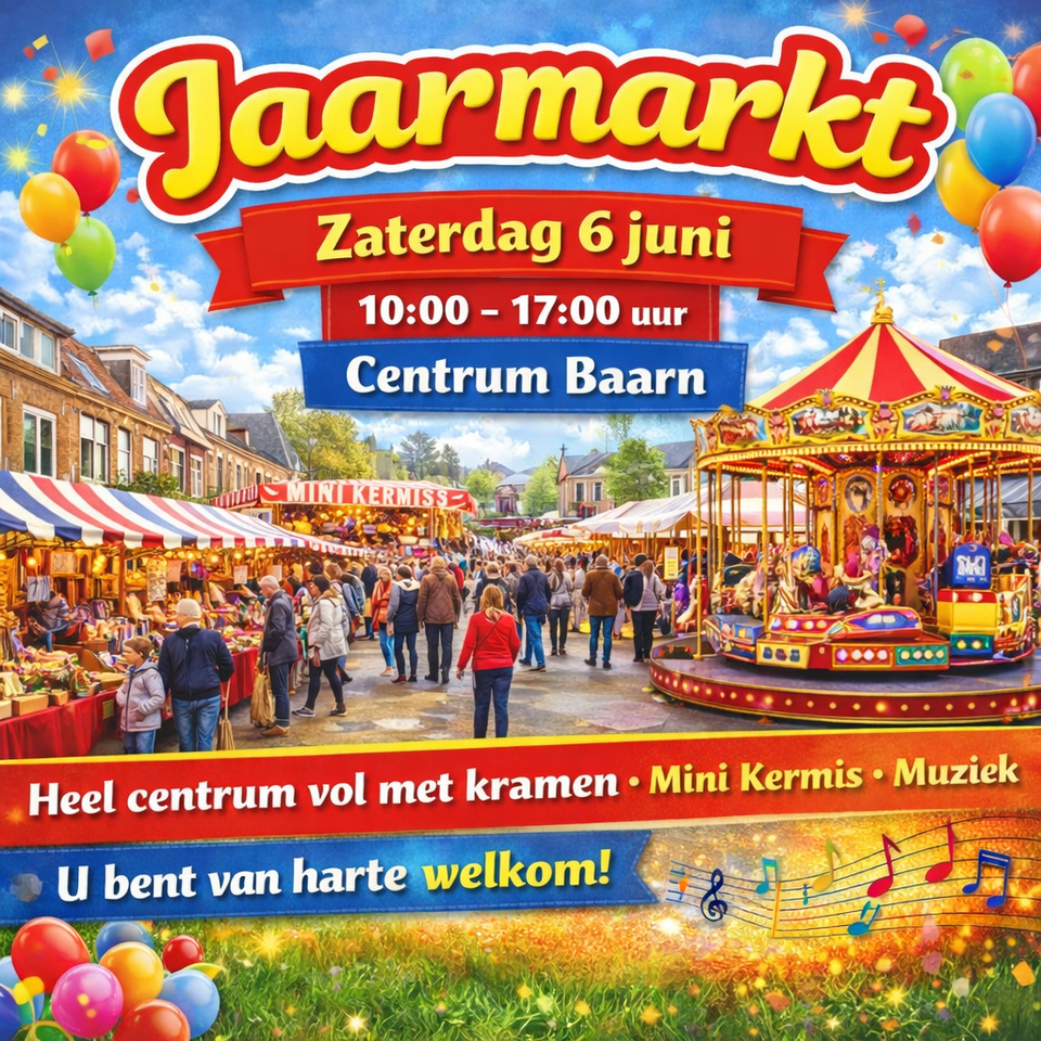 Op zaterdag 6 juni staat het centrum van Baarn volledig in het teken van een grote en levendige jaarmarkt. Van 10:00 tot 17:00 uur bruist het hele dorpshart van activiteit, plezier en gezelligheid.