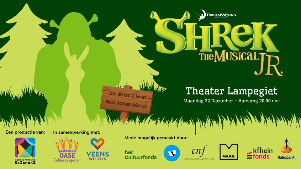 Op 22 december verandert Theater Lampegiet in een sprookjesmoeras vol humor, muziek en kleur! De leerlingen van Musical Academie ReZonanZ brengen de hartverwarmende musical Shrek Jr. tot leven. Een verhaal over jezelf mogen zijn, vriendschap en de kracht van anders zijn. Meer dan 60 leerlingen uit de Basisklas, Opleidingsklassen, Productieklas Tieners én de Musicalclub Panorama schitteren samen op het podium met spetterende dansen, aanstekelijke liedjes en een vrolijk verhaal dat jong en oud raakt. Met deze voorstelling vieren we diversiteit, samenwerking en het plezier van samen theater maken. Een feest voor het hele gezin, waarin iedereen ontdekt dat je pas echt straalt als je durft te zijn wie je bent.