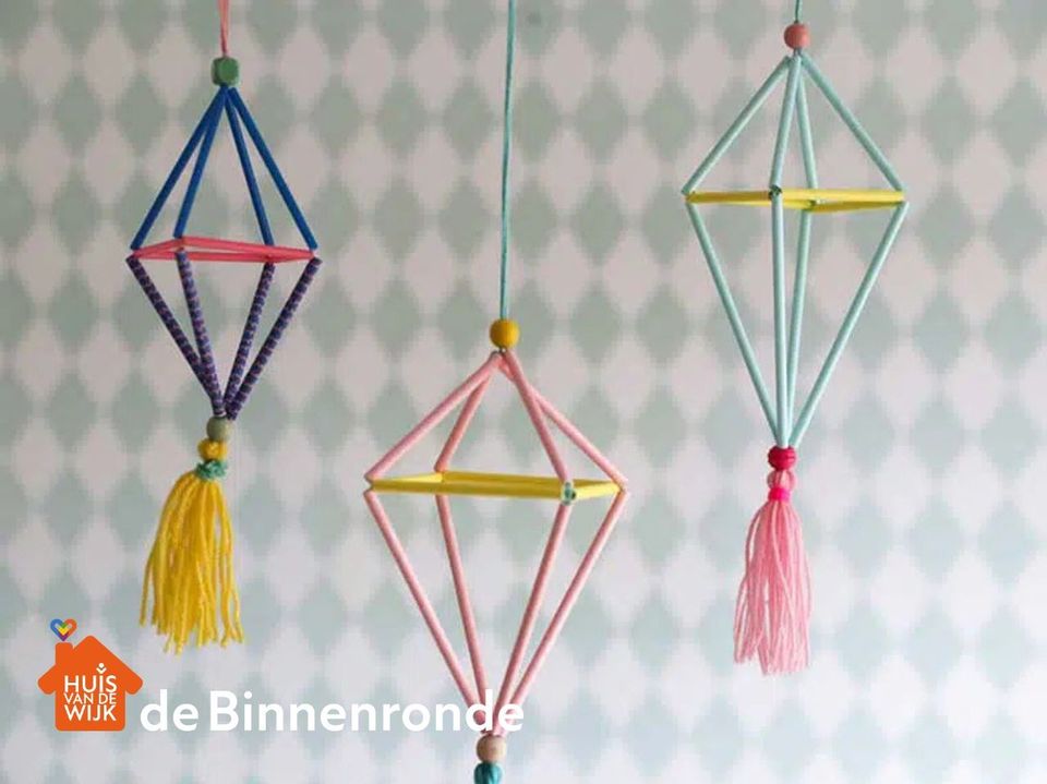 We maken een vrolijke raamhanger van papieren rietjes. Je rijgt, knipt en combineert verschillende vormen en kleuren tot een hanger die mooi beweegt in het licht.