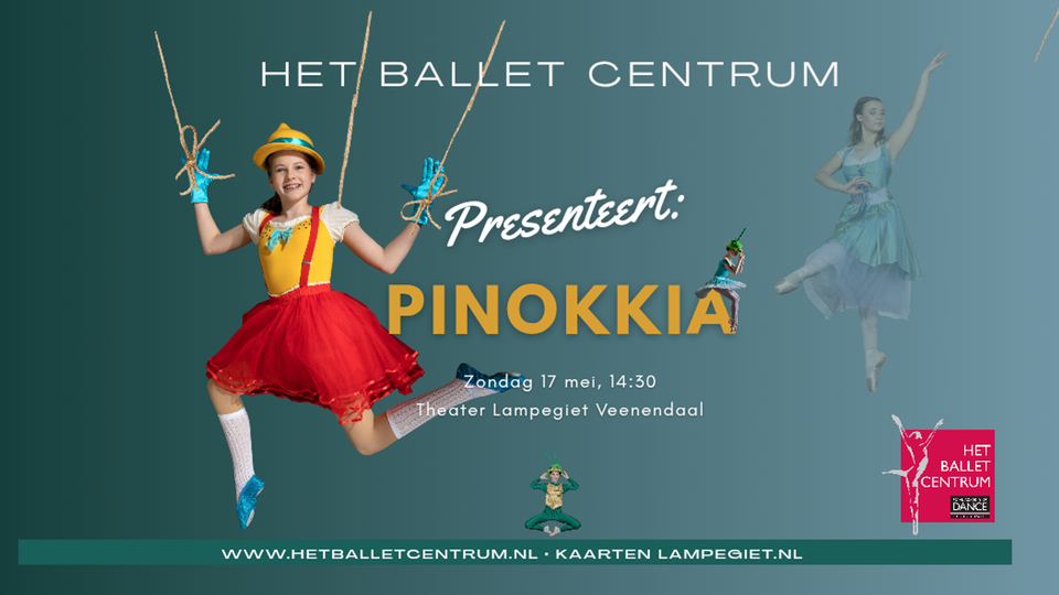 Op zondag 17 mei brengt Het Ballet Centrum de ballet vertaling van het sprookje Pinokkia! op het toneel van Theater Lampegiet in Veenendaal o.l.v Fleur van As Jansen. Onze dansers vertellen het verhaal dat geleid wordt door hoofdrolspelers. Een muzikale voorstelling voor jong en oud en een lust voor het oog door de prachtige kostuums. Kom jij ook kijken hoe het verhaal van Pinokkia gaat?