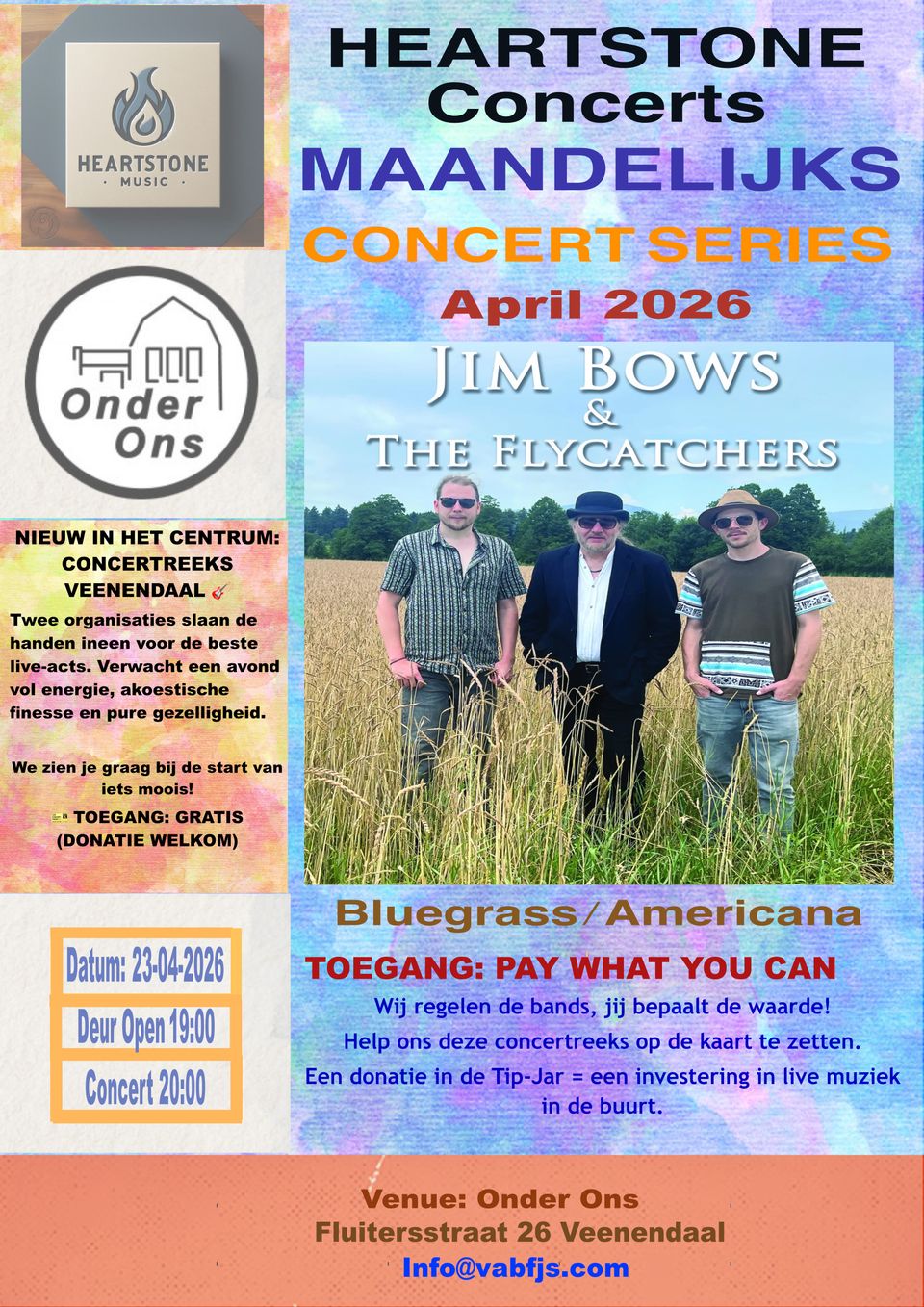 HEARTSTONE CONCERTS EN ONDER ONS PRESENTEERT: JIM BOWS & THE FLYCATCHERS (UK) 🎻 Op donderdag 23 april toveren we Onder Ons in Veenendaal om tot een ontmoetingsplaats voor liefhebbers van eerlijke, handgemaakte muziek. Tijdens deze eerste editie van onze nieuwe concertreeks verwelkomen we een topformatie uit de Britse roots-scene. Wat kun je verwachten? Verwacht een avond die balanceert tussen melancholische Contemporary Folk en de opzwepende ritmes van Bluegrass. Jim Bows & The Flycatchers spelen originele, akoestische "toe-tapping music". Jim, Bensch en Josh zijn multi-instrumentalisten die moeiteloos wisselen tussen gitaar, dobro, mandoline en bas. Hun sound, gekenmerkt door prachtige meerstemmigheid en virtuoos snarenwerk, doet denken aan de sfeer van artiesten als Gregory Alan Isakov of de energie van de vroege Mumford & Sons. Of je nu komt voor de verstilling van de folk of de ‘high lonesome sound’ van de bluegrass: dit wordt een avond waarin vakmanschap centraal staat, zonder de intieme sfeer van de zaal te verliezen.