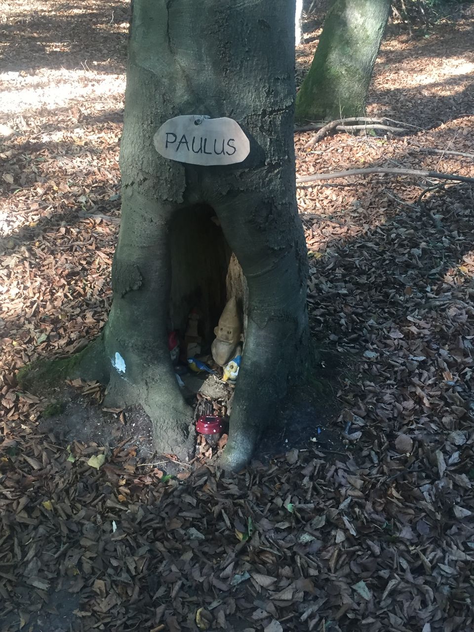Tegen het eind van mijn fietsroutes over de Utrechtse Heuvelrug kom ik deze holle boom met kabouter Paulus vaak tegen. En als ik op de fiets langskom dan staat hij altijd paraat.