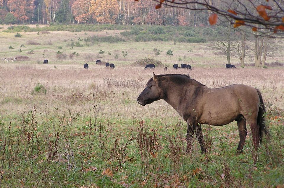 Precies bij het wandelpad is een drinkplaats voor de dieren. Er staat een bankje om als wandelaar even te kunnen rusten. Ik zat daar met mijn gezin toen we opeens de kudde paarden over de heuvel aan zagen komen. Er staat heel mooi aangegeven dat je de kudde niet mag doorkruisen maar wat moet je als er opeens tientallen paarden om je heen lopen? Wij gingen rustig staan, ik nam mijn kind op de arm zodat we goed gezien zouden worden. Terwijl de dieren langs ons liepen kwam er eentje duidelijk even poolshoogte nemen. Pas toen die gerustgesteld was dat we geen kwaad in de zin hadden ontspande de kudde en konden wij volop genieten van natuurlijk gedrag: drinken, grazen, rollen door de modder etc. Het is me sindsdien vaker gebeurd dat de kudde bijvoorbeeld op en langs het pad aan het grazen was. Altijd neemt één paard dan het initiatief om even te kijken wat ik daar aan het doen ben, en geeft me vervolgens (gevoelsmatig) toestemming om door de kudde te wandelen.